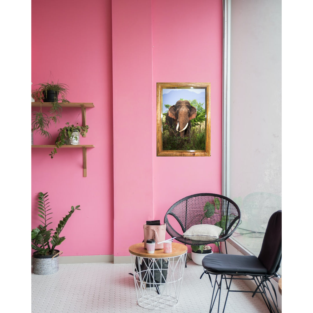 Stunning Photography: Features a high-resolution fine art print of an elephant gracefully moving through the dense greenery of Corbett National Park, highlighting the serene majesty of wildlife.
